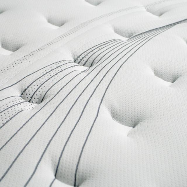 AFTON White/Gray 12" Euro Box Pocket Coil, Cal.King, 84"L X 72"W X 12"H, 90lbs. 12"" Euro box pocket coil with designer stretch fabric anda Multi layer HD polyurethane foam innerspring support base.Available in Full, Queen, Cal.King, and E.King sizes. Features: Quilting: Designer stretch fabric 5 layer tack and jump quilting HD polyurethane foam Safety: Hanes Stratus FR Cover Edge Support: 360 Foam encase edge support system 3.5 Lumber Support: Individual Pocket Coils Innerspring: Foam Encased Individual Wrapped High Profile Pocket Coil With 6 Gauge Border Wire Foam: Multi layer HD polyurethane foam innerspring support base Stitching: Deluxe Grey 1 1/2 Coil Counts: Twin:450 Full:660 Queen: 800 EK and CK: 992 (coil counts based on full perimeter) Comfort: Medium Plush Warranty: 10 Year Non-Prorated