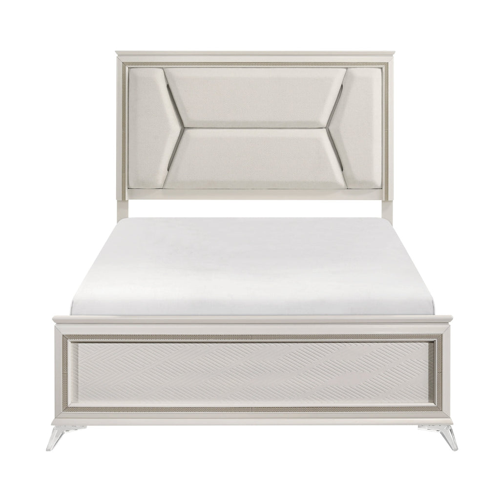 Transform your bedroom into a luxurious retreat with this stunning white and gold panel bed. Crafted with a durable engineered wood frame, complemented by unique acrylic front legs and sturdy metal rear legs, this queen bed offers a perfect blend of style and stability. The chenille upholstered headboard, featuring built-in LED lighting, adds a touch of modern glamour while providing a comfortable backrest. The diagonal grain embossed panels on the headboard and footboard create a sophisticated texture, enhancing the overall visual appeal. This bed includes a headboard, footboard, and rails, providing a complete framework for your sleeping sanctuary. A foundation or box spring is required, ensuring optimal mattress support. Assembly is required.