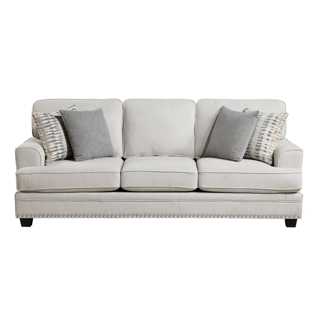 With a transitional design that is a complement to your home’s living room, the Bradford Collection utilizes classic lines, refined texture, and traditional accenting to achieve a universally appealing look. The sofa is covered in gray chenille fabric upholstery. Nail head trim accents the base rails, while profile-defining welting provides a tailored finish. Complementing contrast toss pillows are paired with the sofa.