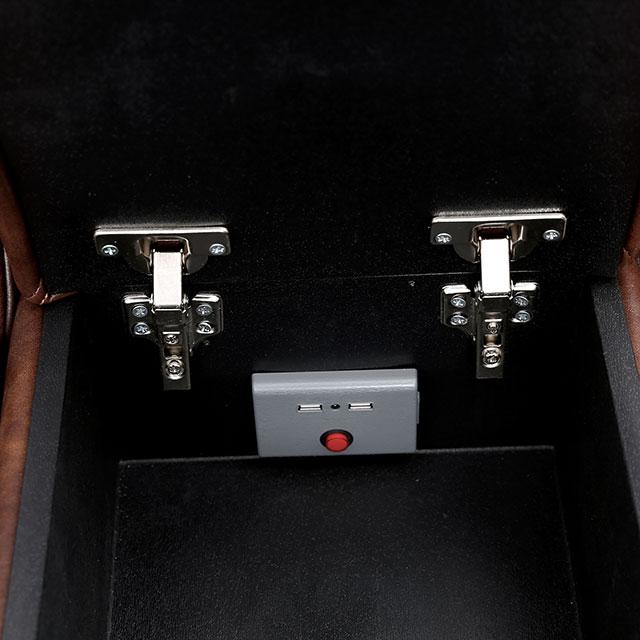 CALLIE Power Sectional, 123 1/2"L X 123 1/2"W X 40 1/2"H, 597.89lbs. Enjoy the high back plush comfort of this seven-piece sectional. This beautiful sectional consists of three recliners with power headrests activated by a simple touch of a button, a corner seating wedge, and two storage consoles with cup holders and a USB power outlet. The two end power headrest recliners feature accent lighting under the footrest for added ambiance in a dimly lit room. There are removable cup holders in each arm for added functionality and convenience. The cover is a two-tone faux leather with a three-year wear warranty.