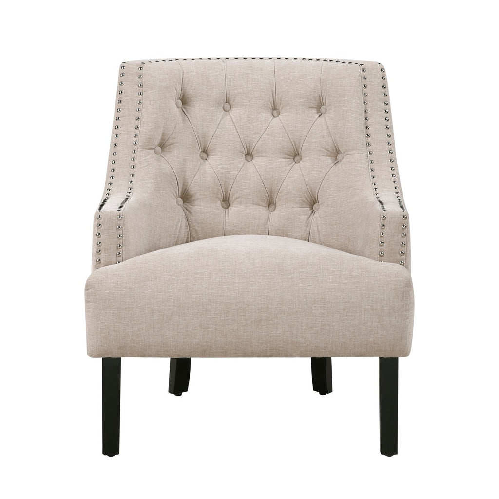 High polish nailhead accents and defines the profile of the Charisma Collection. This modern-traditional black fabric-covered accent chair provides a stylish, yet functional addition to your home.