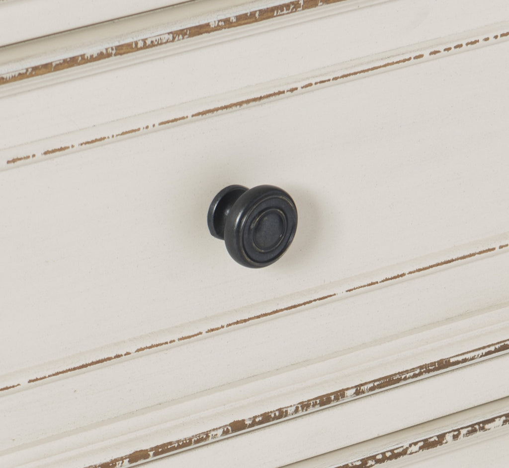 Soft, sweeping curves define the elegant profile of the Baylesford Collection. The nightstand is softened by an antique white rub-through finish with a brown-gray finished framed-plank top, creating a romantic aesthetic will place beautifully within your bedroom. Dark finished metal knob hardware provides complementing contrast to the drawer fronts.
