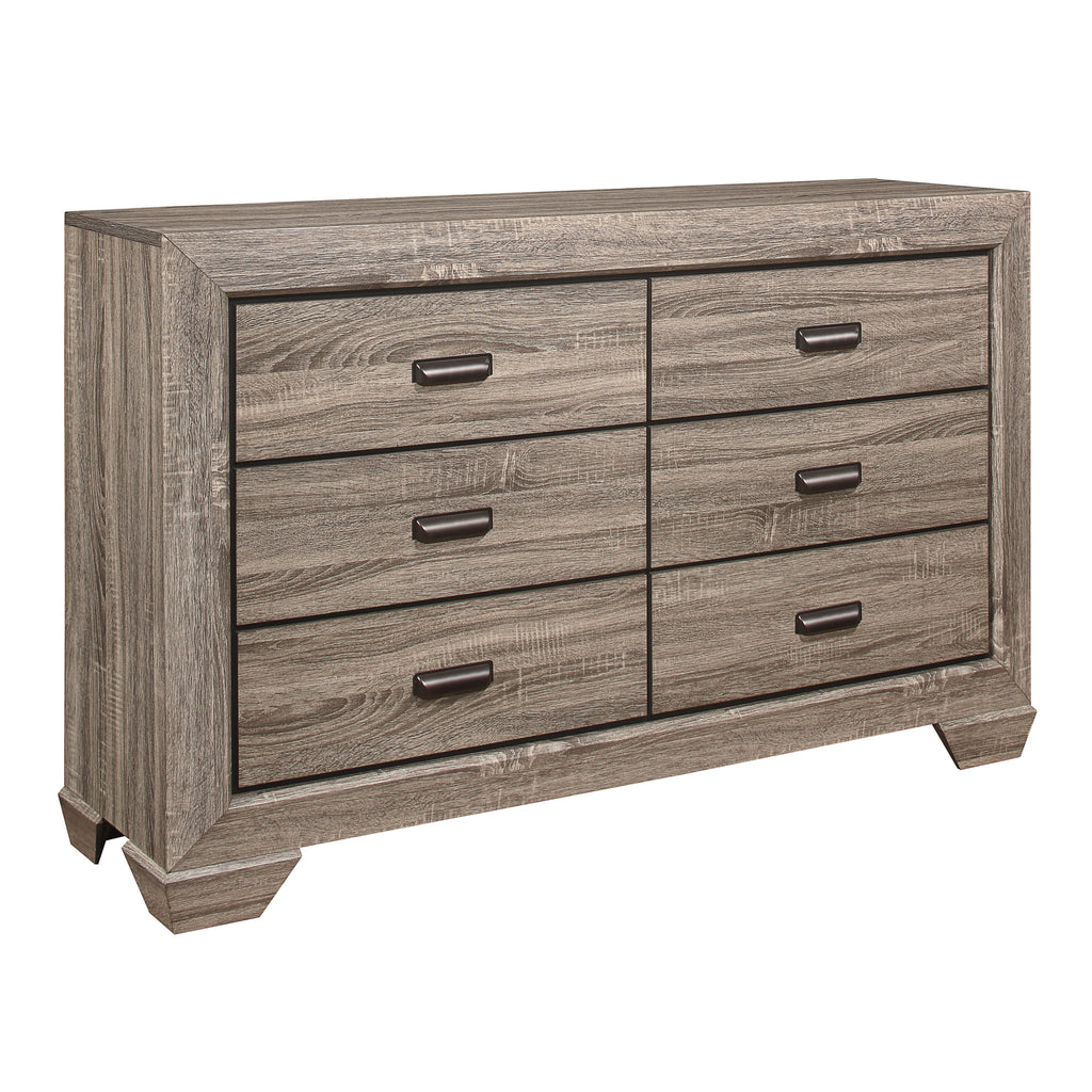 Blending the elements of contemporary design and rustic aesthetic, the Beechnut Collection is a unique addition to your bedroom. Dark under-paneling serves to highlight the natural finish enhancing the embossed faux-wood veneer of the dresser's drawer fronts. Contrasting cup hardware punctuates each drawer front.
