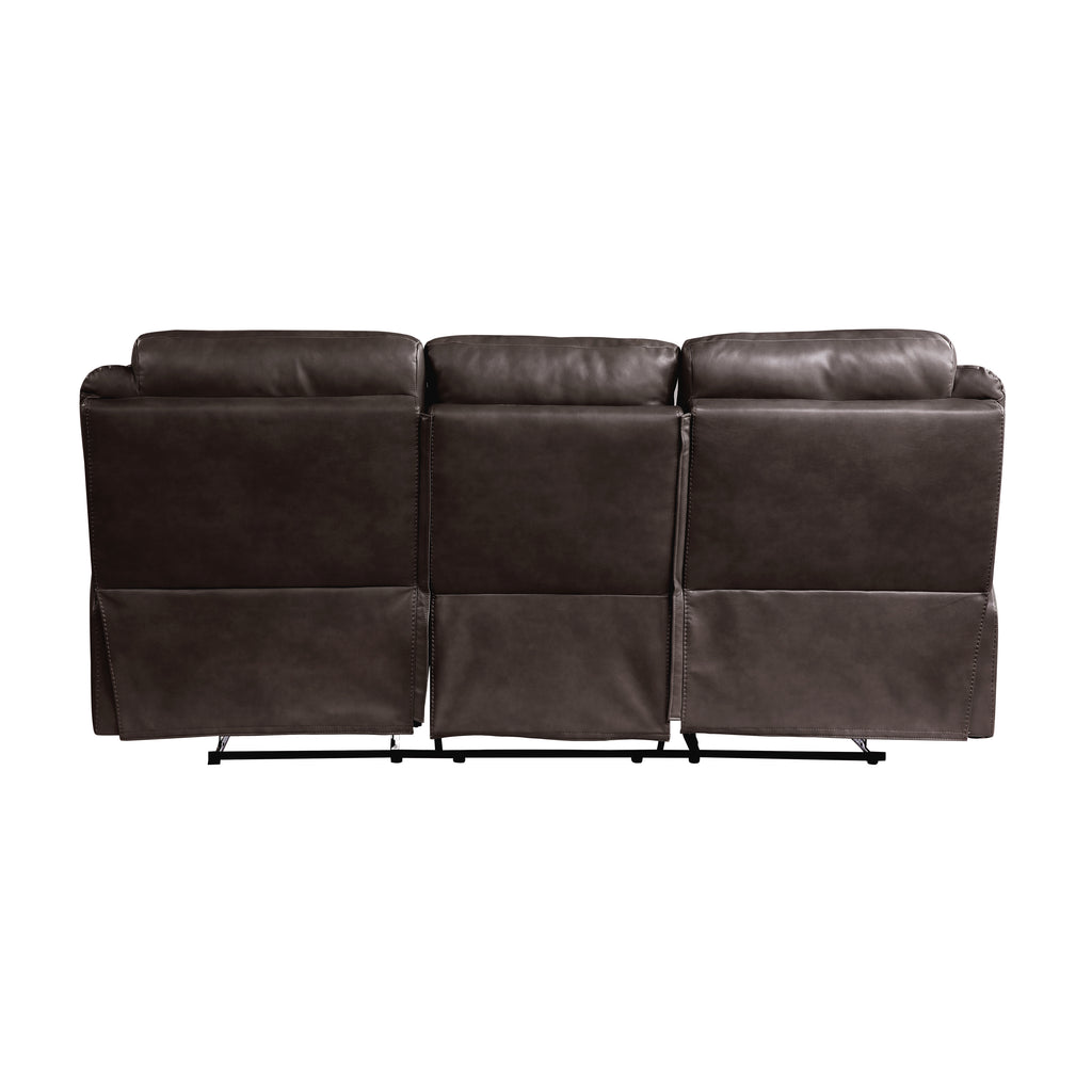 With amply appointed offerings that create not only a comfortable seating experience but a functional one as well, the Aram Collection will be a welcome addition to your home. Dark brown breathable faux leather covering for comfort and style that will blend effortlessly with your transitional decorative preference. Manual motion mechanisms operate with the pull of a side-mounted tab, that once engaged, take you from seated to reclined in an easy motion. The sofa features dual reclining ends and a drop down center seat back with cup-holders, electric receptacles, USB port and tabletop space.
