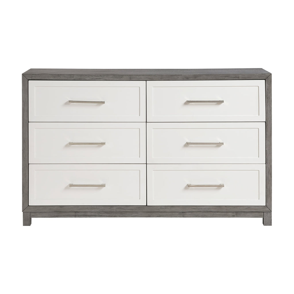 Add a touch of modern sophistication and ample storage to your bedroom with this two-tone 6-drawer dresser, featuring a unique ivory and gray finish crafted from okume veneer, wood, and engineered wood. This dresser boasts six dovetail drawers with smooth ball-bearing glides, providing ample space for your clothing and belongings. Polished nickel-tone bar pulls add a touch of contemporary elegance, while the sturdy construction ensures durability. Perfect for any bedroom, this dresser combines style and functionality. Assembly is required.